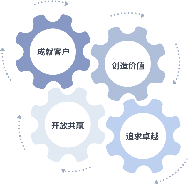 成就客户是一切决策的出发点,,创造价值是衡量所有工作的标准,,追求卓越是我们做事做人的态度,,,开放共赢是我们的格局也是最终的结果。。价值观的齿轮环环相扣,,,,推动着组织里的每个人不断向前。。。。